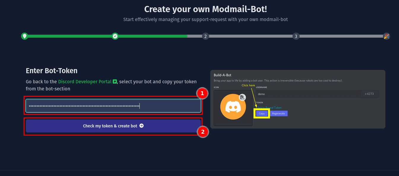 Als Nächstes wirst du dazu aufgefordert, den Token einzugeben, den du in Schritt 1 erhalten hast. Füge deinen Token dort ein und klicke auf "Prüfe meinen Token & erstelle den Bot". SCNX wird deinen Token überprüfen und dich zum nächsten Schritt weiterleiten, falls der Token gültig ist.
